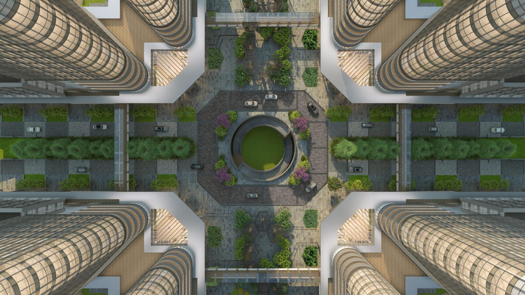 Modern lobbies, high-speed lifts, landscaped plazas, retail promenades, food court, parking, security, and power backup